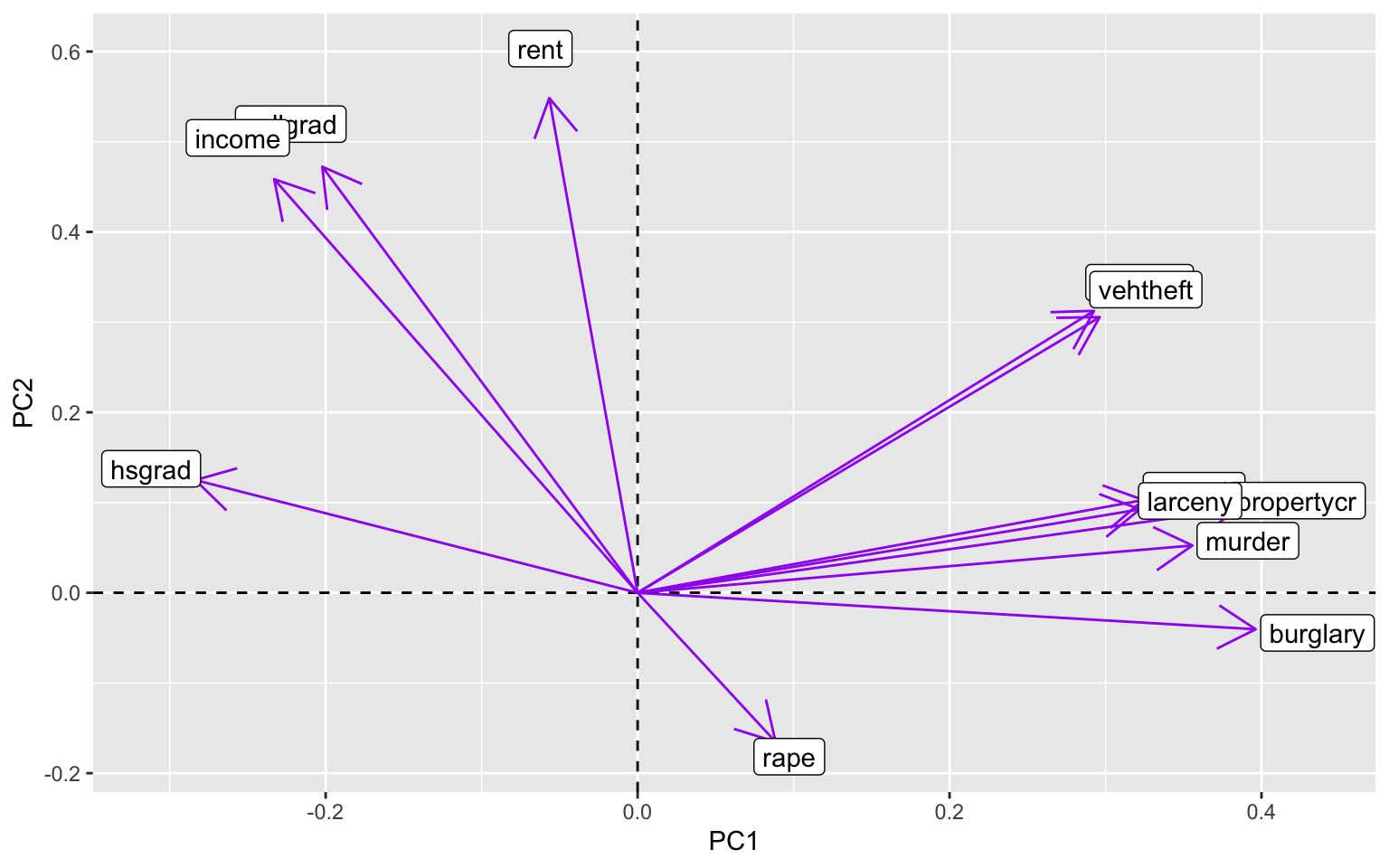 This process was largely influenced by the code we completed in WS11, and it was helpful in making these plots above. The datasets that I used for this project ended up being a lot less correlated with each other than I thought they would be. Based on the initial scree plot, the variance wasn’t tremendously explained by each PCA (PC1 explained approximately 46% of the variance). Because of this, the following scatterplot that was made with the first two PCs didn’t have enough data to creat ellipses over the PCs. This was also due to the small size of this dataset, but it was still disappointing to see. There were no defined clusters of points that could have been PCs, so the next graph to look at was a graph showing correlation between the variables of these PCs. This graph was pretty telling, because certain crimes are very correlated with each other, while other crimes are vrey far off from the others (e.g. rape). What was particularly interesting to me about this last graph was the high correlation of college graduation rates and median income values. The high correlation of rates of larceny, burglary, and property crimes also makes sense, because they can be intermingled when classifying crimes of theft. I still have a lot to learn about PCA and using eigenvalues, among other things, and I hope we get more chances to practice this in the future!